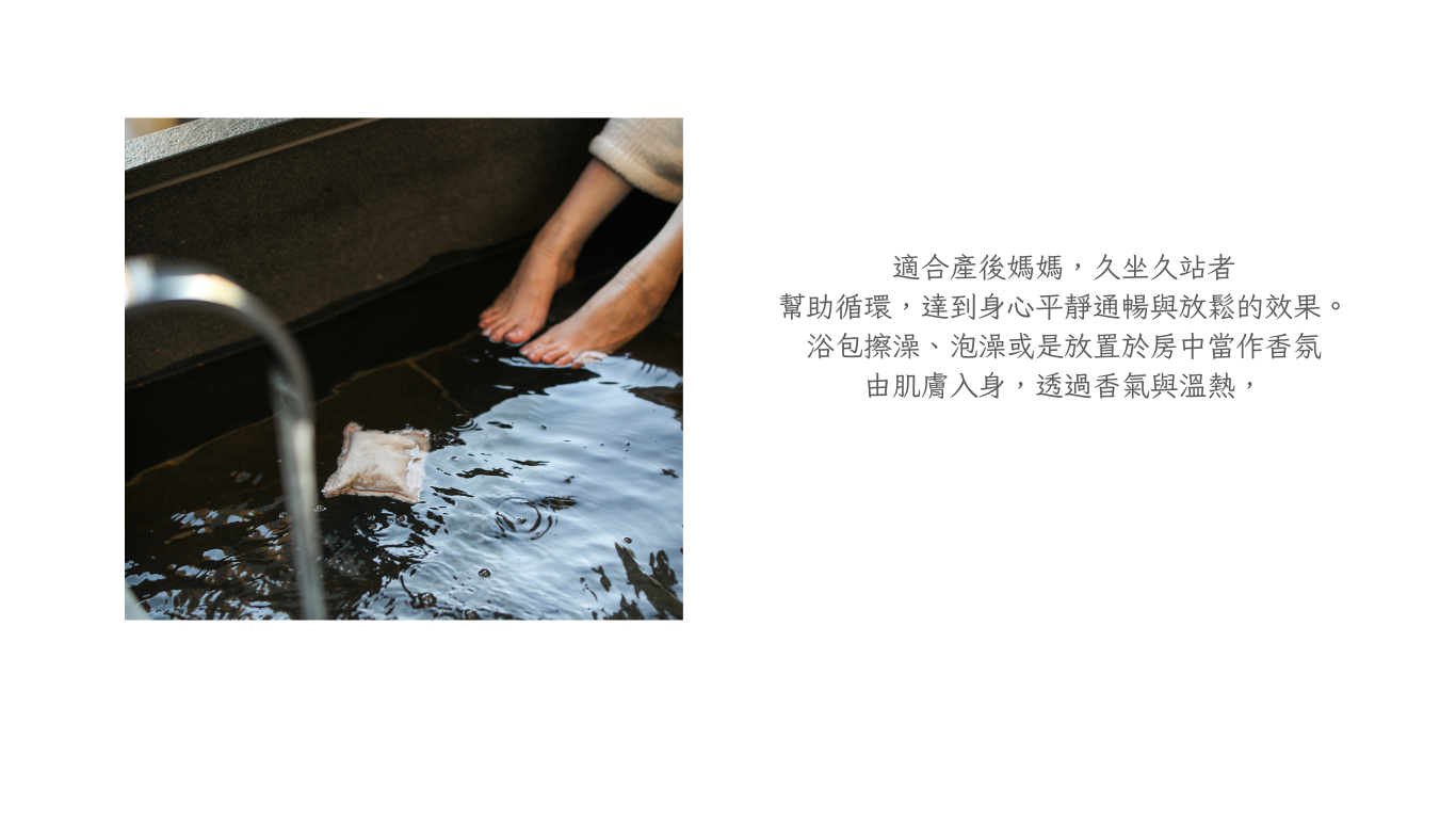 由肌膚入身,透過香氣與溫熱,達到身心平靜通暢與放鬆的效果。