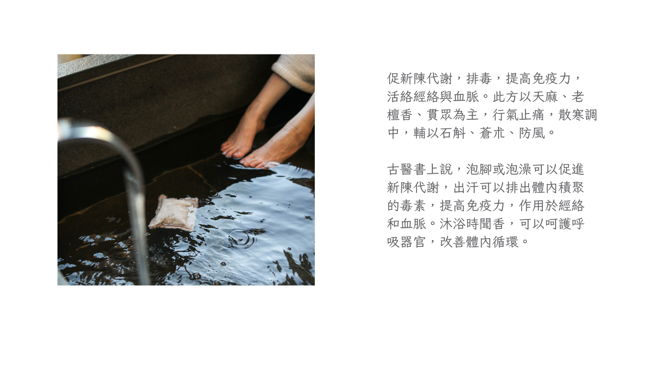 古醫書上說,泡腳或泡澡可以促進新陳代謝,出汗可以排出體內積聚的毒素,提高免疫力,作用於經絡和血脈。沐浴時聞香,可以呵護呼吸器官,改善體內循環。