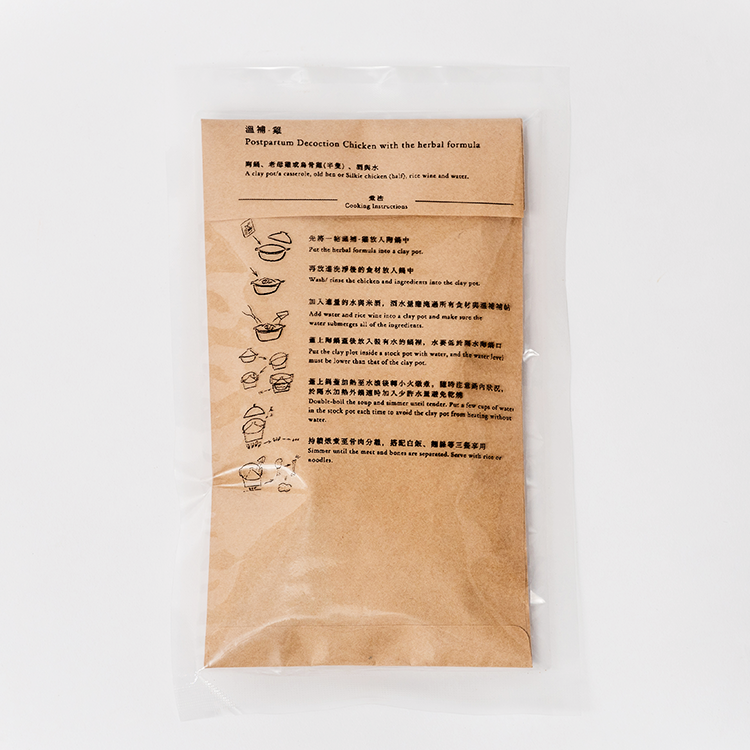 將一帖放入陶鍋中加入400cc(約2碗水)與400cc米酒(水酒1比1),加入肉類600克,小火悶煮約20-25分鐘,煮至160cc(約8分滿)服用。