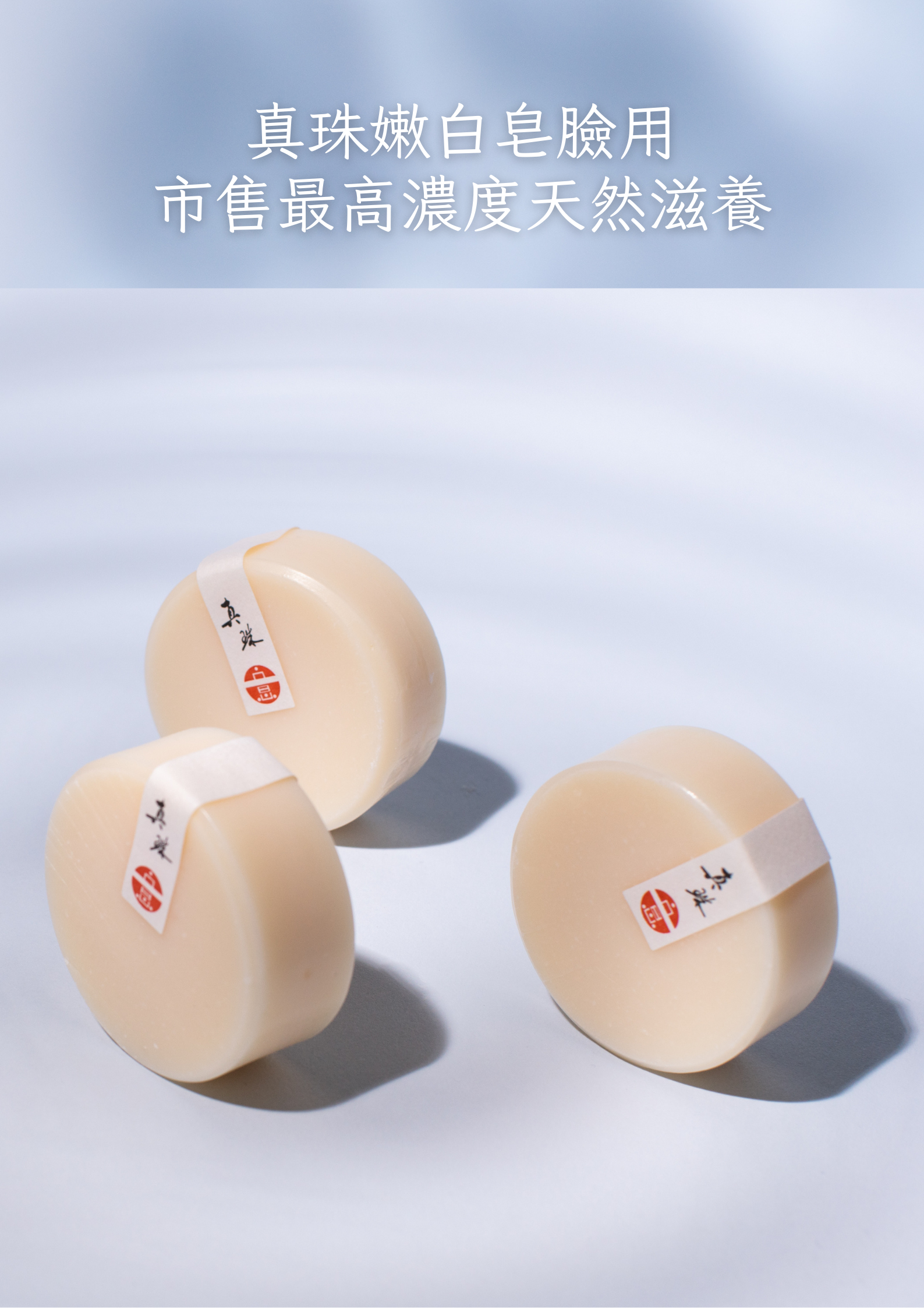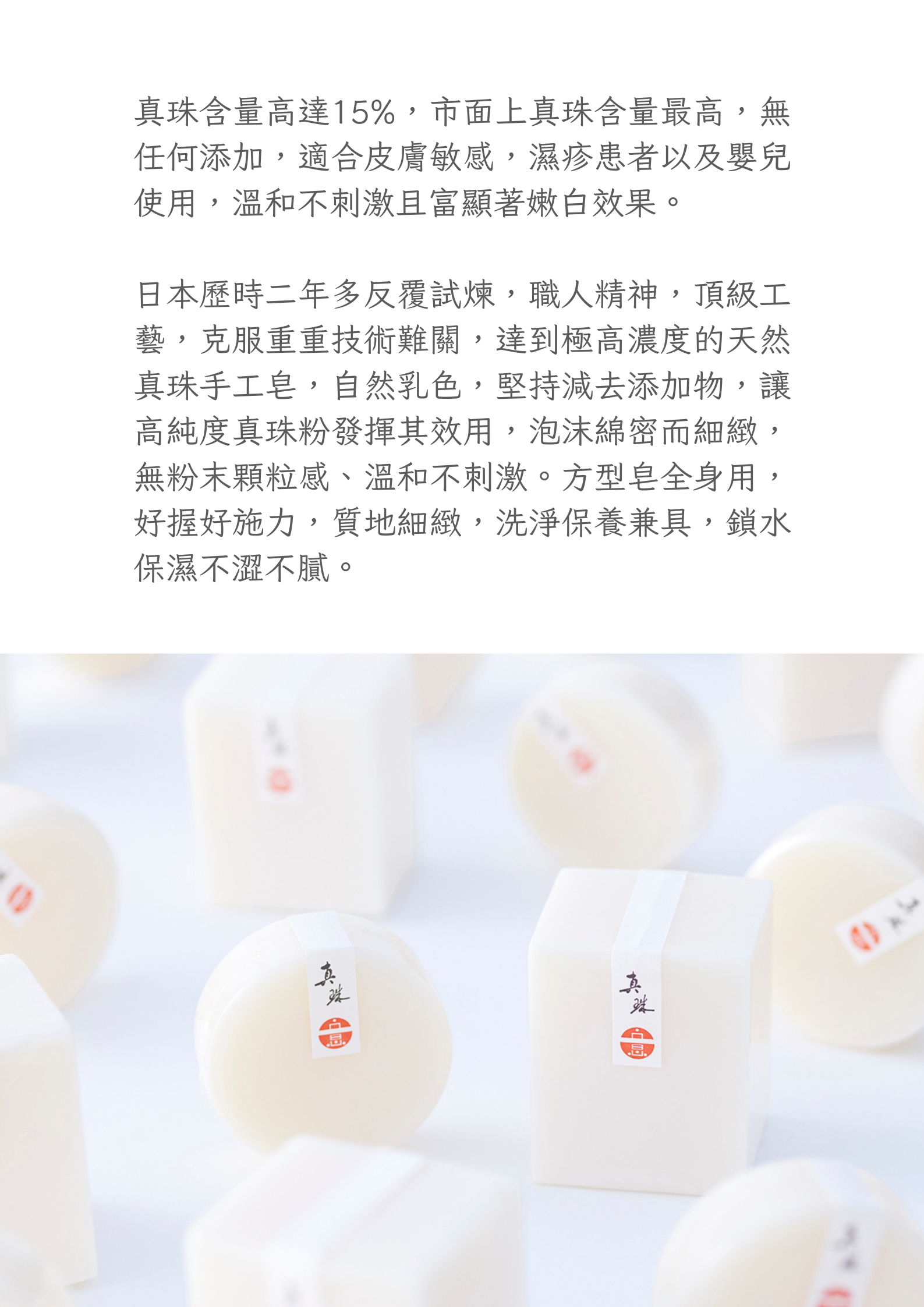 日本歷時二年多反覆試煉,職人精神,頂級工藝,克服重重技術難關,達到極高濃度的天然真珠手工皂,自然乳色,堅持減去添加物,讓高純度真珠粉發揮其效用,泡沫綿密而細緻,無粉末顆粒感、溫和不刺激。圓型皂臉用,貼合臉部輪廓,極高真珠含量,質地柔滑細緻,洗淨保養兼具,鎖水保濕不澀不膩,更重要是自然嫩白效果,長期使用效果尤其顯著。