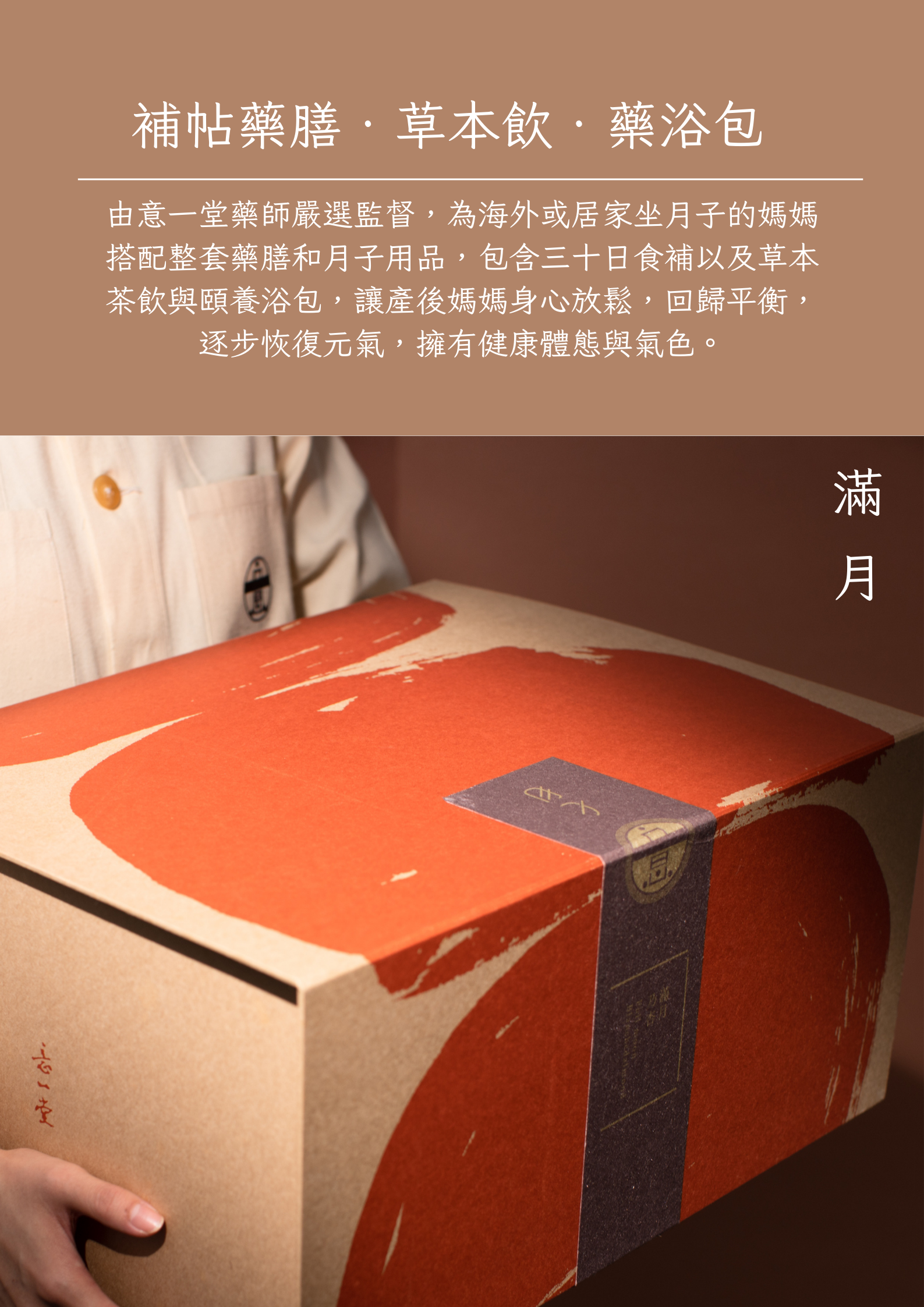 由意一堂藥師嚴選監督,為海外居家坐月子的媽媽搭配整套藥膳和月子用品,包含三十日食補以及草本茶飲與頤養浴包,讓產後媽媽身心放鬆,回歸平衡,逐步恢復元氣,擁有健康體態與氣色。